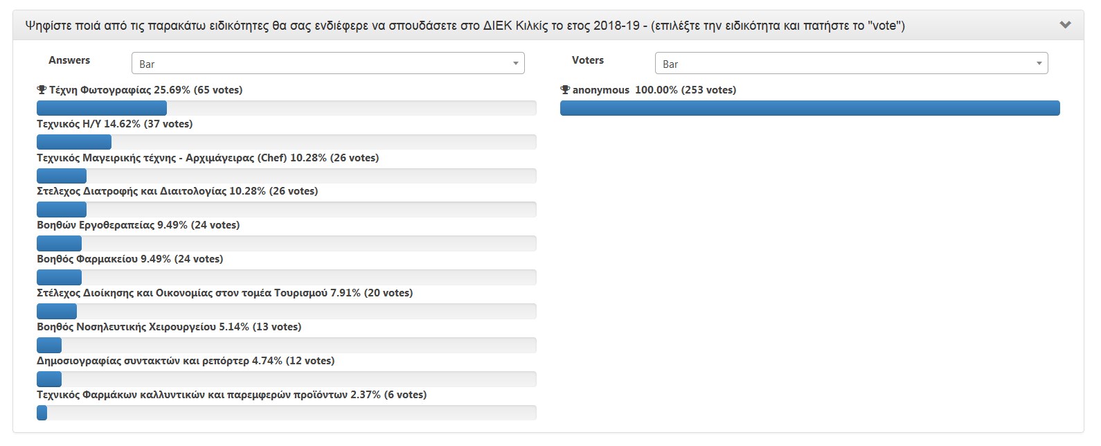 Αποτελέσματα δημοσκόπησης για τις ειδικότητες 2018-2019 23 Ιουλίου 201823 Ιουλίου 2018 iekkil_admin Την Δευτέρα 23 Ιουλίου 2018 η ψηφοφορία ολοκληρώθηκε. Ευχαριστούμε τους 253 που συμμετείχαν σε αυτή. Ακολουθούν τα αποτελέσματα.